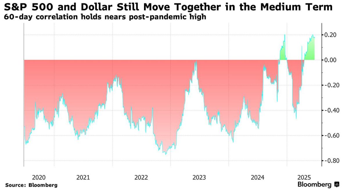 不过,在更长的时间范围内,大约两个月的时间里,美元仍与美国股市呈正相关。这意味着,随着全球风险情绪改善,美元往往会走强,反之亦然——这与美元作为全球投资者避险货币的传统角色发生了巨大转变。