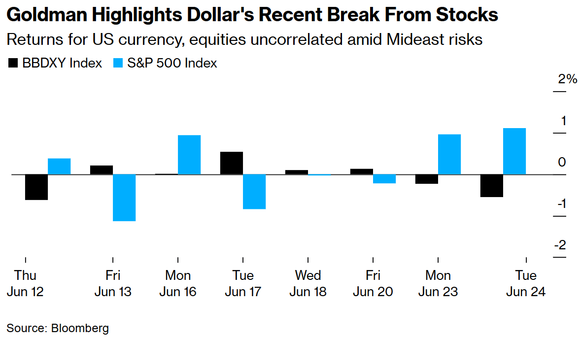 高盛策略师Stuart Jenkins、Teresa Alves和Isabella Rosenberg周三在报告中写道,过去八个交易日美元走势与标普500指数相反,与今年早些时候美国总统特朗普发动贸易战后美国资产普遍遭到抛售期间美元与风险资产的正相关关系形成鲜明对比。