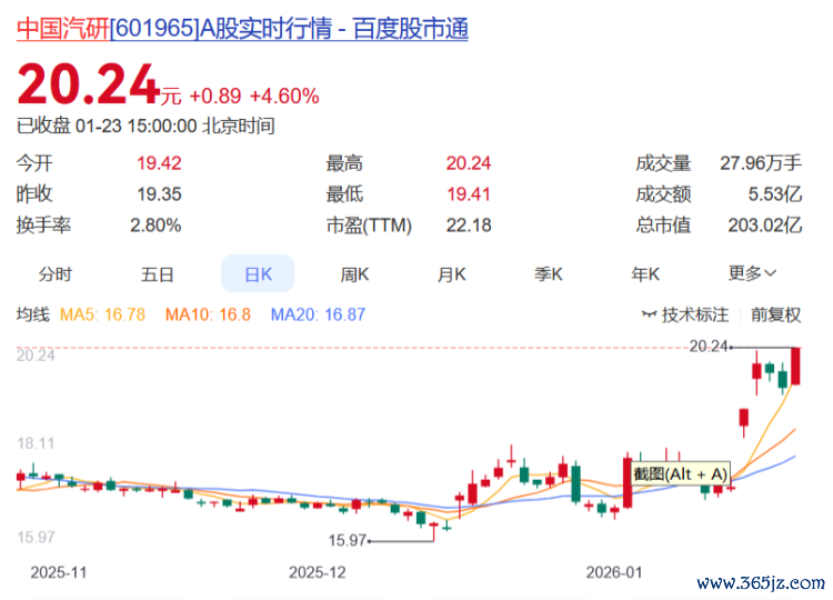 中国汽研报收20.24元,日涨幅4.60%,换手率2.80%,周涨幅17.88%,今年以来涨幅21.93%。
