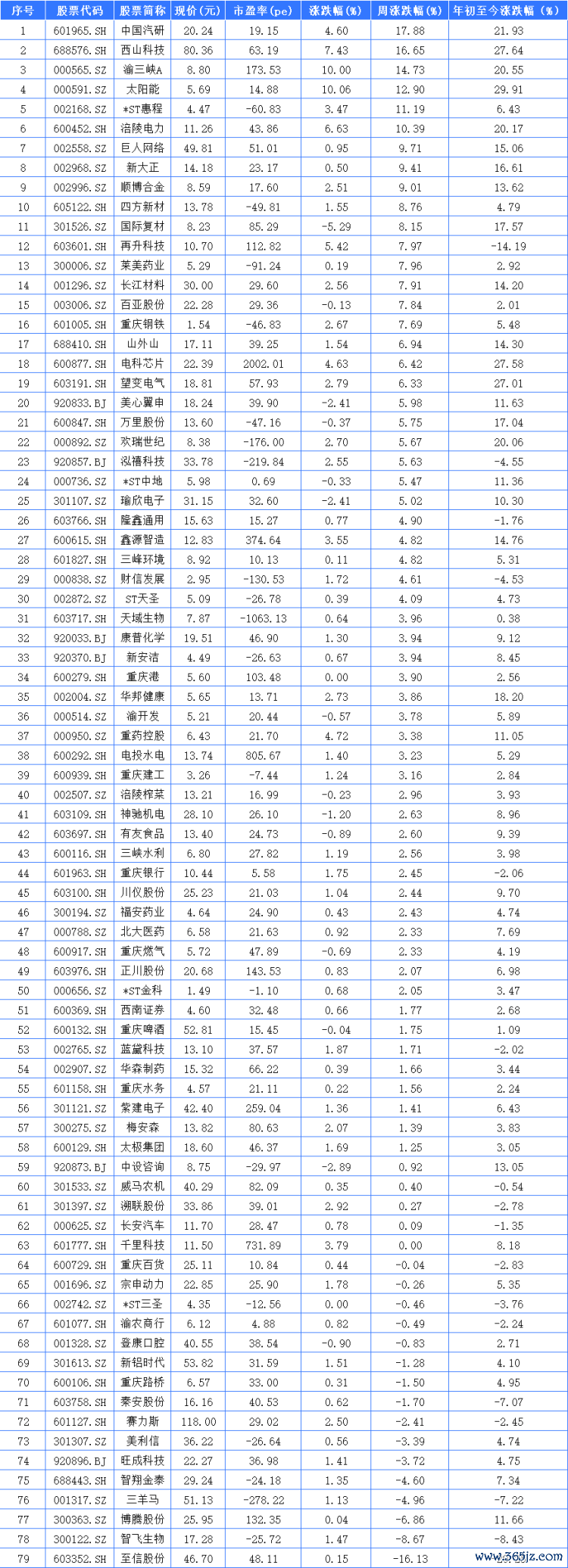 领涨的股票中,中国汽研、西山科技和渝三峡A分别以涨幅17.88%、16.65%和14.73%,位居重庆A股本周涨幅前三强。