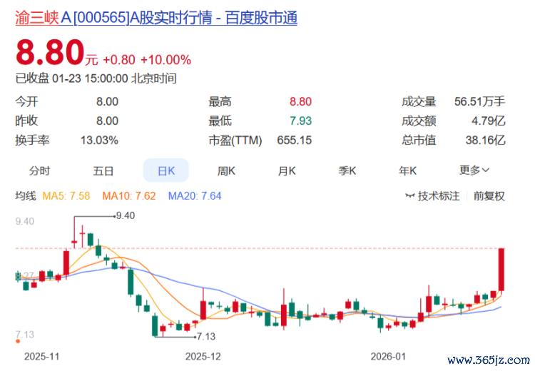渝三峡A报收8.80元,日涨幅10.00%(涨停),换手率13.03%,周涨幅14.73%,今年以来涨幅20.55%。