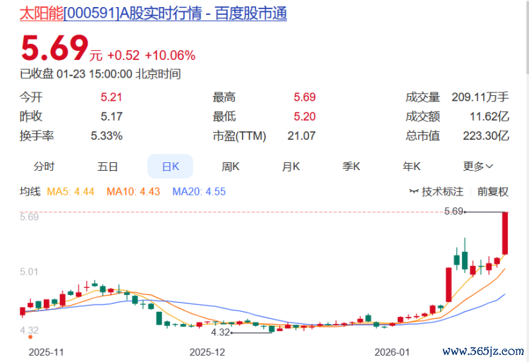 太阳能报收5.69元,日涨幅10.06%(涨停),换手率5.33%,周涨幅12.90%,今年以来涨幅29.91%。