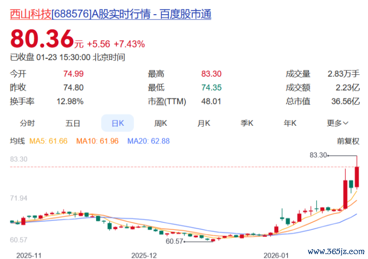 西山科技报收80.36元,日涨幅7.43%,换手率12.98%,周涨幅16.65%,今年以来涨幅27.64%。
